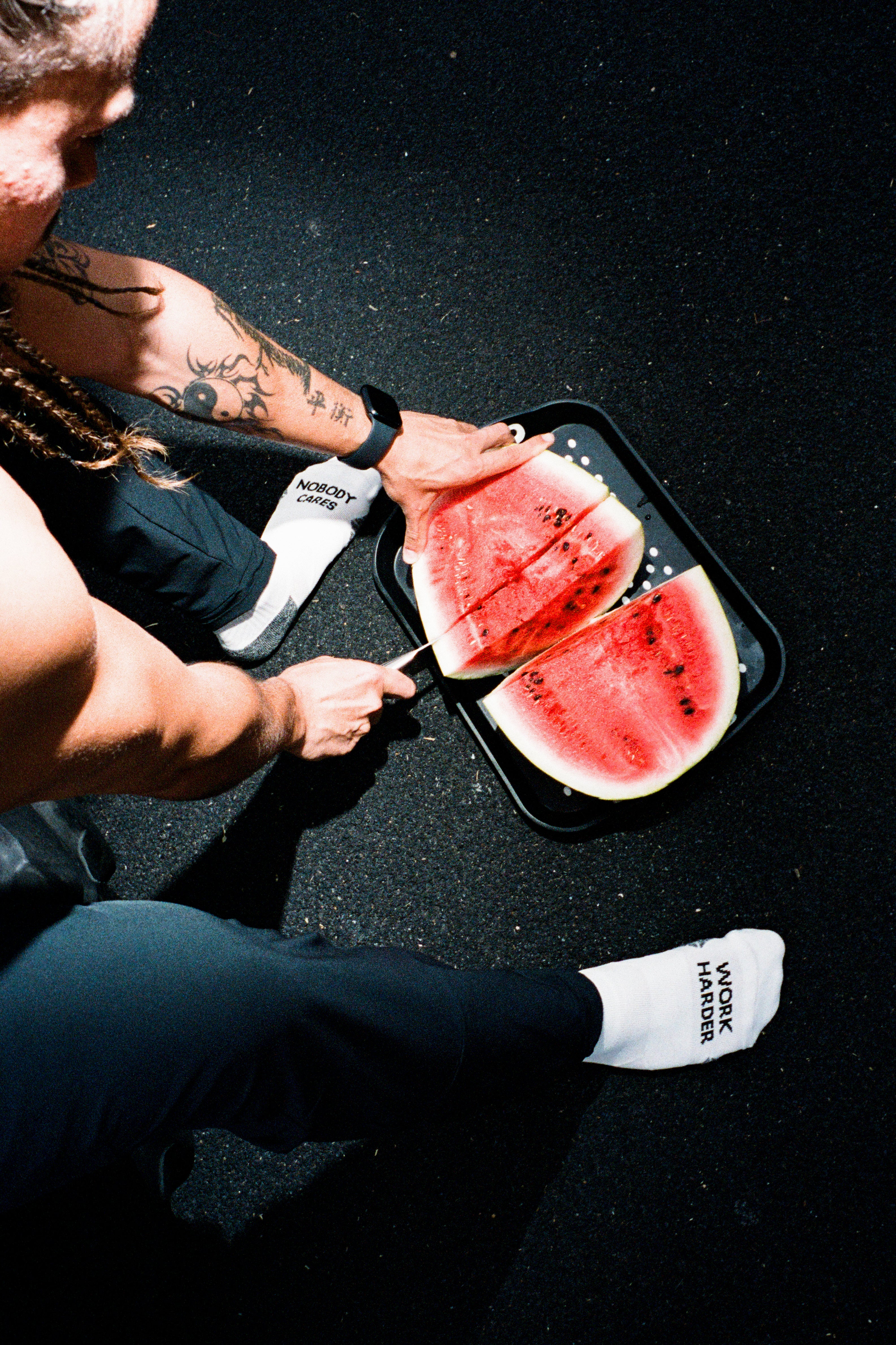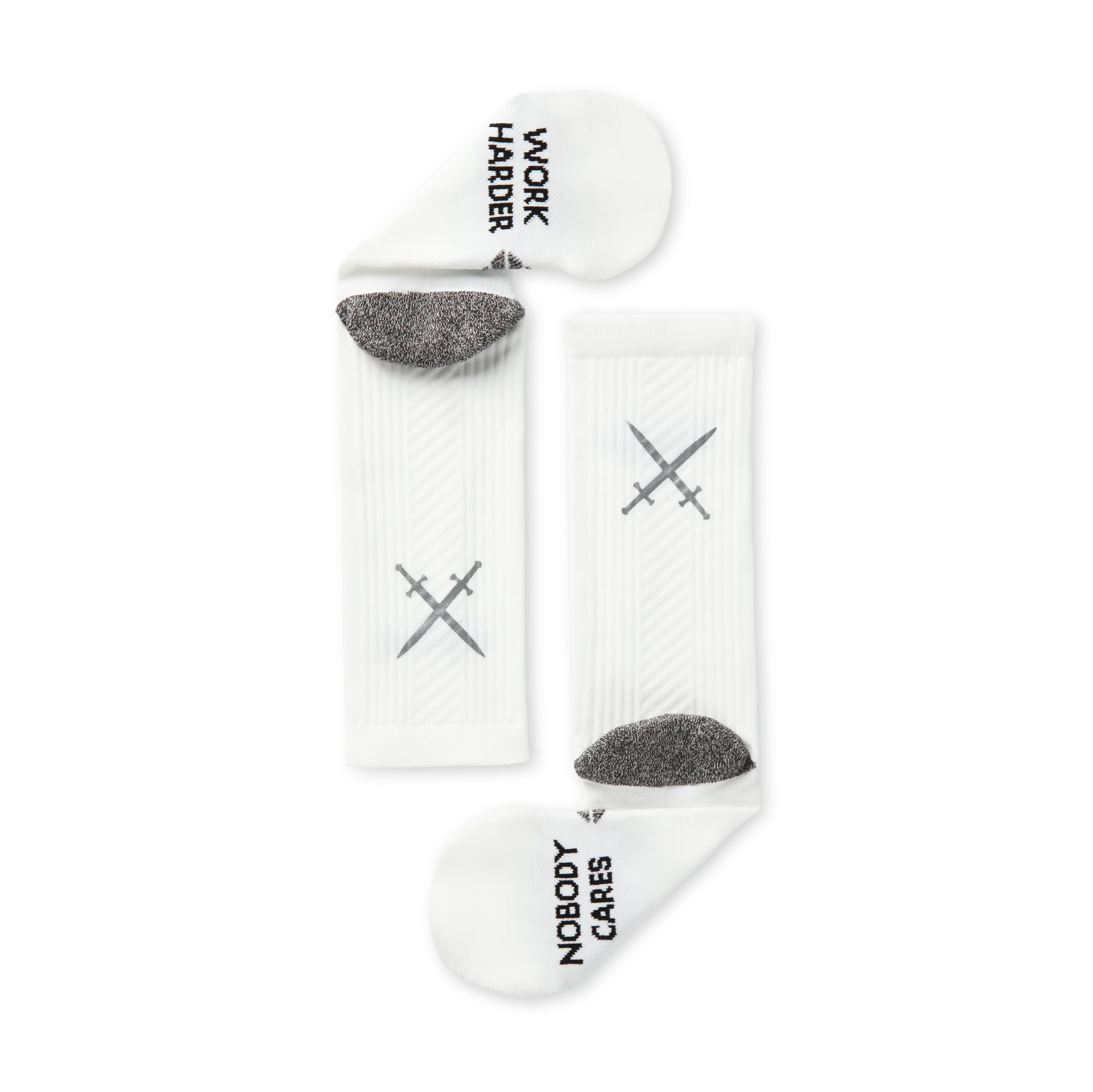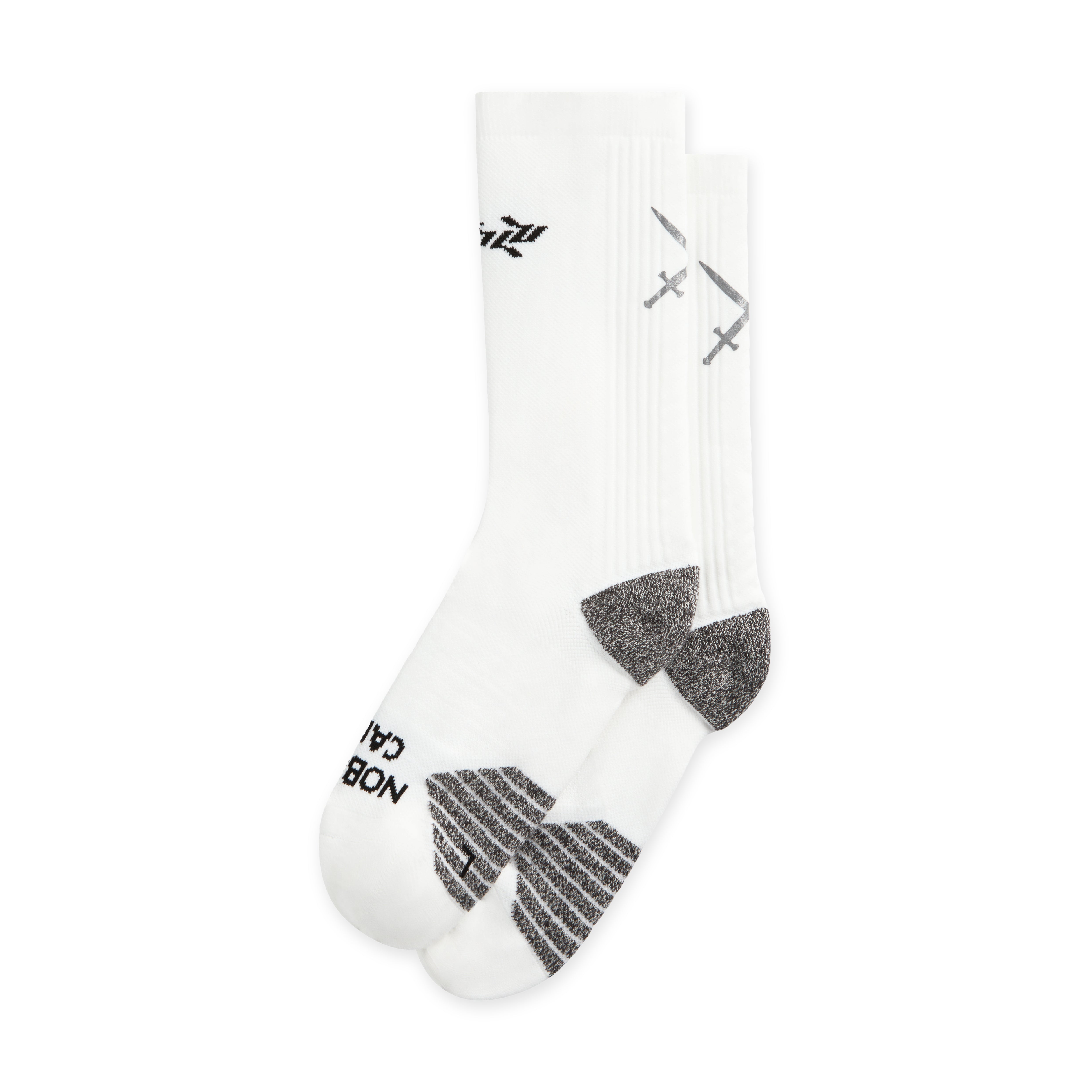 • 1 PAIR. • WHITE NOBODY CARES PERFORMANCE SOCKS. • REFLECTIVE SWORDS ON THE ACHILLES.